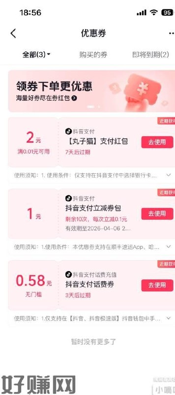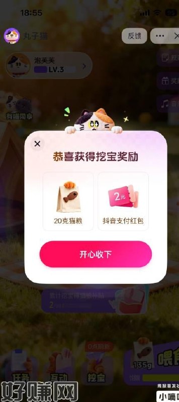 抖音火山版,点我的钱包,手机充值有个领养猫的小游戏弹窗,点进去喂食几次得 3 元支付红包